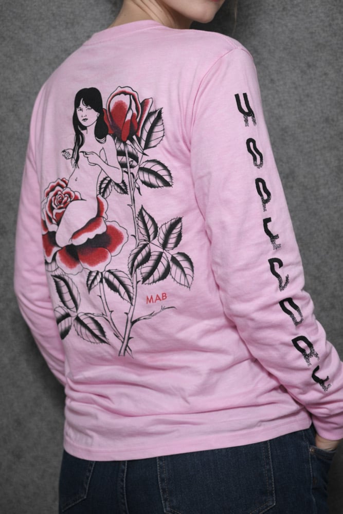 Pale pink long-sleeve T-shirt with screen-printed artwork.